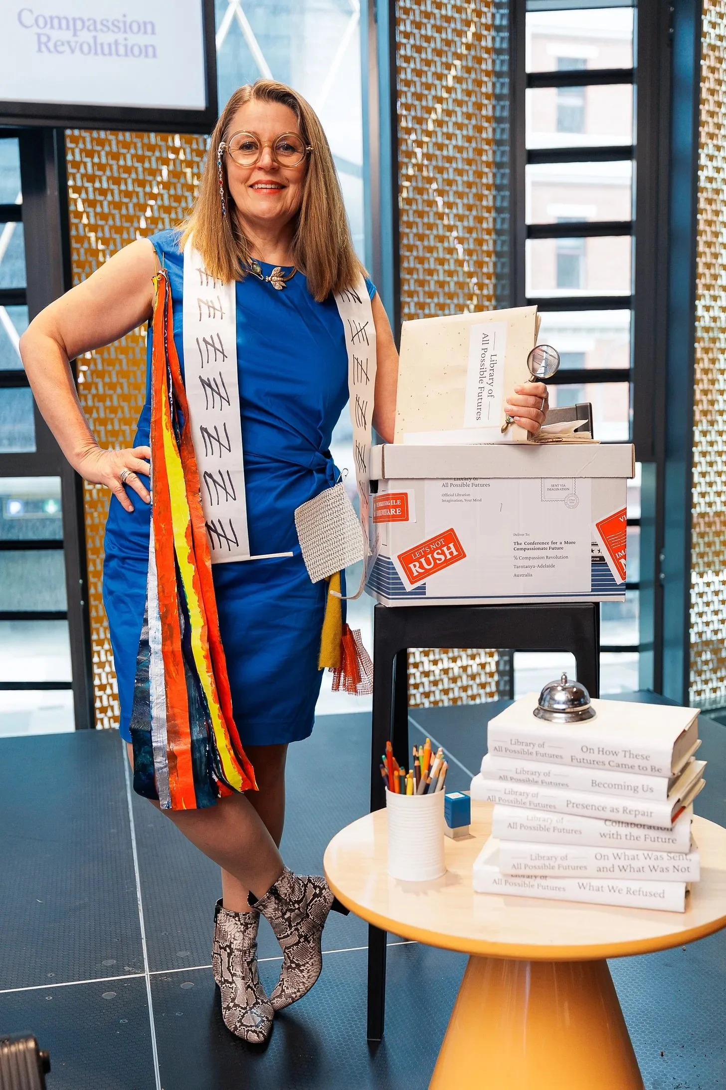 I created a box to be delivered as an interruption on stage, a special delivery from the Official Librarian at the "Library of All Possible Futures." This imaginative framework created a shared space between now and next for us to participate in chapters of imagined futures—where repair replaced punishment and where disconnection was replaced with intimacy.