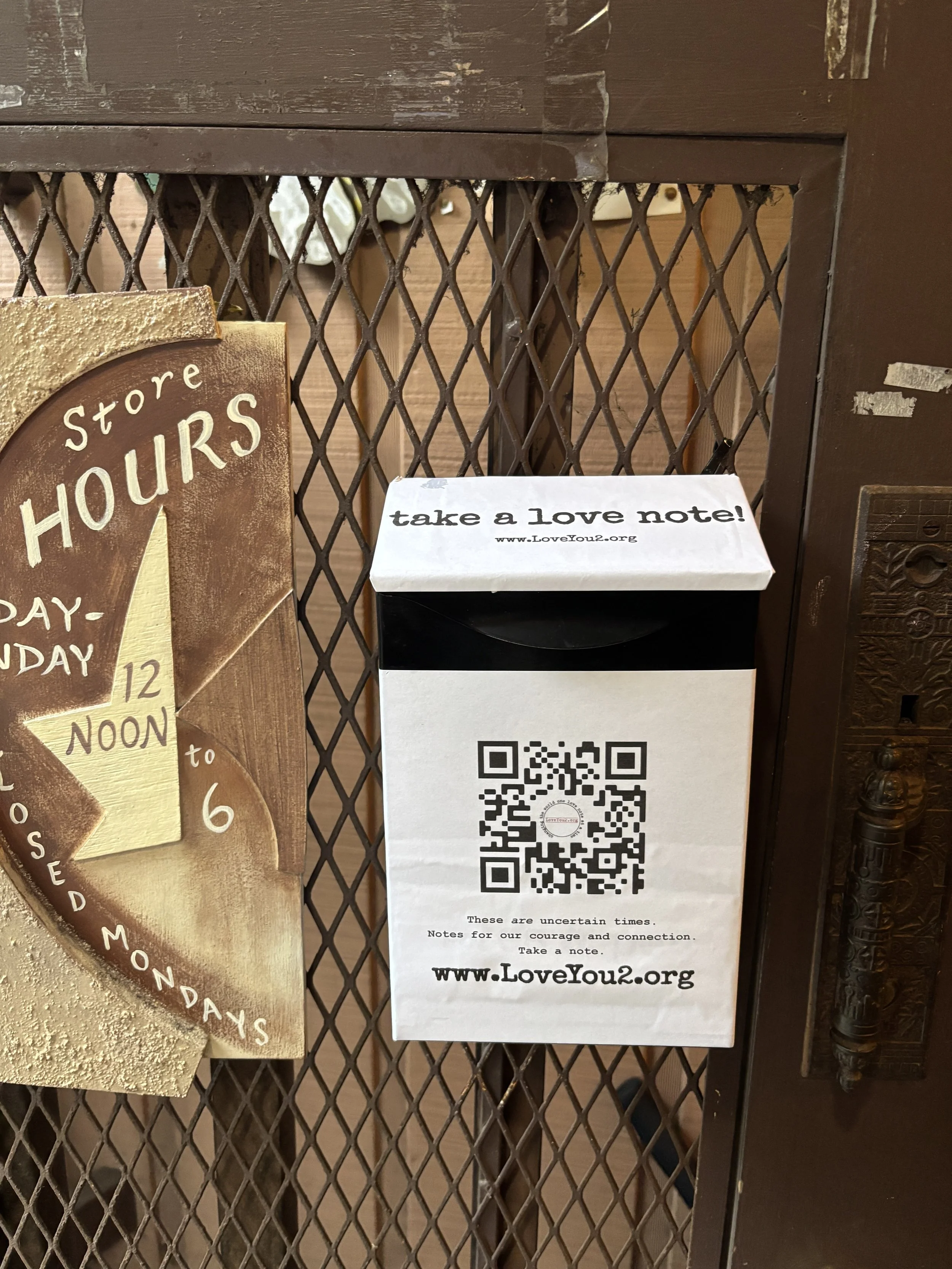 I have installed a mailbox full of love notes to our courage at Bird and Beckett in San Francisco’s Glen Park neighborhood. I love an independent book store and Bird and Beckett also hosts concerts and poetry readings, a delightful combination.