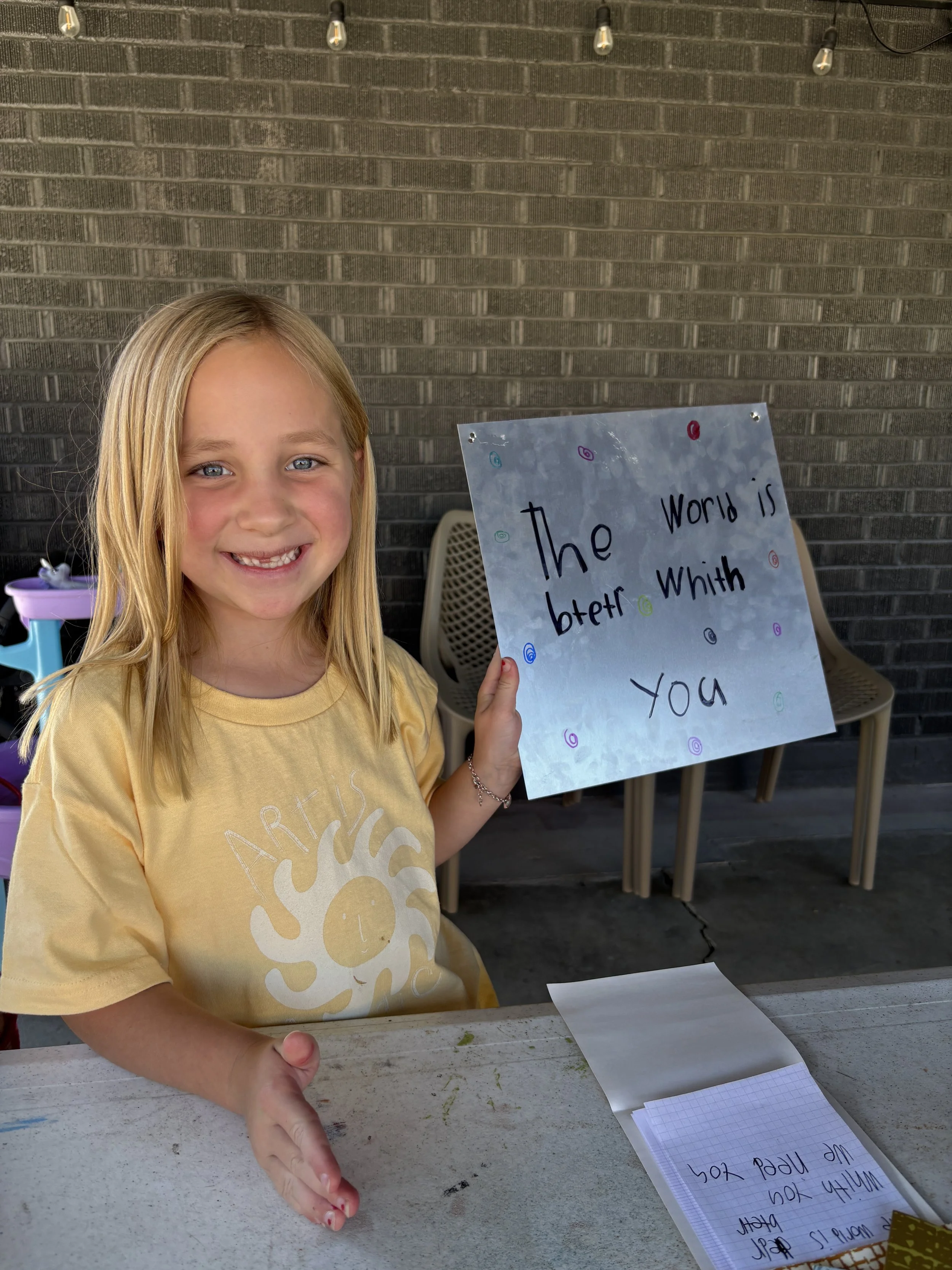 Art turned power to the people. The third was peak summer joy: making art with my young nieces, who wanted to create LoveYou2 signs. I brought stencils in my suitcase and we secured spray paint. As we sat in their backyard planned our pieces, I was delighted to discover my young niece already had her own vision: "The world is better with you." She practiced sketching it out before creating her masterpiece with paint pens. But her street art soul truly came alive when she tried the spray paint and stencils – the ritual shake of the can, the unabashed joy of feeling paint explode onto a found canvas. Here was intergenerational analog resistance: choosing creation over consumption, choosing collaboration over isolation.